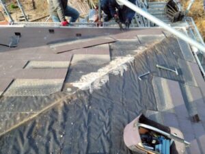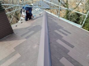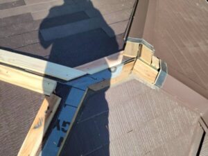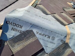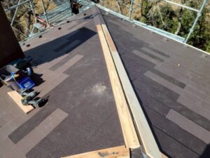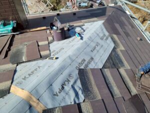 本来ならば葺き替えで、傷んだ野地板からルーフィング全て、新しいものに交換することが最適な状態ではあります。今回は部分修理ですので、捲った部分に新しいルーフィングを敷きこみ、当分の間、棟を雨からブロックできる仕様に。