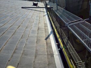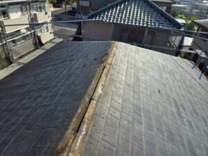屋根材表面が色褪せ、光沢を失い脆弱化している様子が分かります。