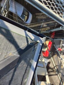 屋根材の異なる面同士が合わさる部分には、構造上どうしても隙間ができるのですが、こちらの写真でも、隙間が守られず開いたままなのがお分かりいただけると思います。放置すると軒先から雨水が回り、深刻な雨漏りになっていたでしょう。